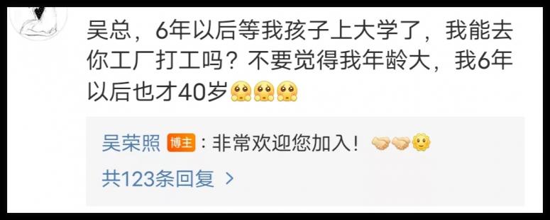 有网友留言:吴总,6年以后等我孩子上大学了,我能去你工厂打工吗?不要觉得我年龄大,我6年以后也才40岁。吴荣照回答“非常欢迎您的加入”。