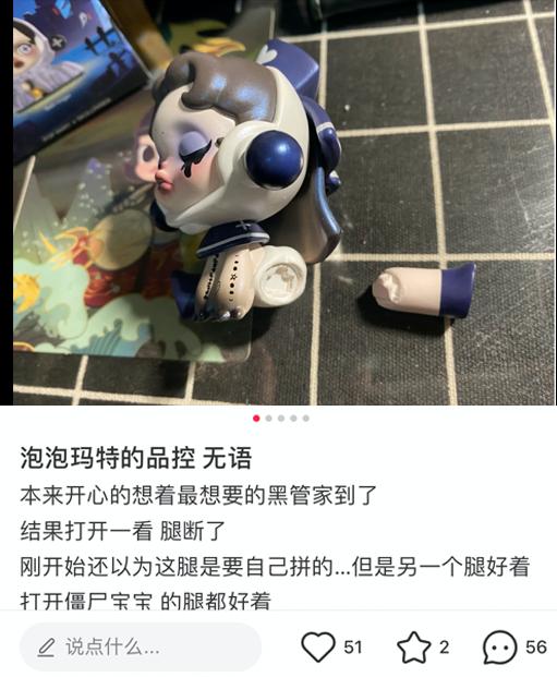 但随之而来的问题是,大量出货,让品控和售后都显得“不走心”,泡泡玛特也随之变成了“拉垮玛特”。