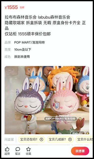 例如,泡泡玛特Labubu怪物嘉年华盲盒原价仅59元,其隐藏款美人鱼在某二手交易平台卖出了1899元的高价,翻了32倍;Labubu森林音乐系列盲盒售价为59元,隐藏歌唱家也卖出1555元高价,翻了26倍。