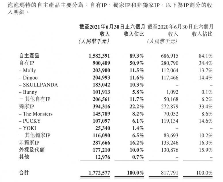 2021年上半年,在自主产品收入中,自有IP的收入占比为50.9%,其中,4个头部自有IP收获了自有IP 77%的收入。头部IP Molly实现收入2.04亿元,Dimoo实现收入2.05亿元,而剩下的8个自有IP仅获得收入2.07亿元。