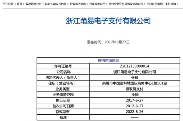 甬易支付是一家从事第三方支付结算业务的国有控股企业,于2012年6月获得支付业务许可证。