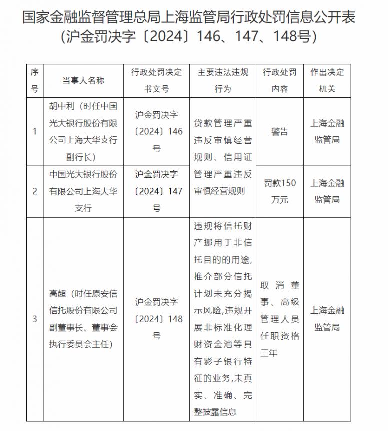 近日,国家金融监督管理总局上海监管局发布行政处罚信息公开表,中国光大银行股份有限公司(以下简称“光大银行”)上海大华支行因贷款管理严重违反审慎经营规则、信用证管理严重违反审慎经营规则,被处罚金150万元。