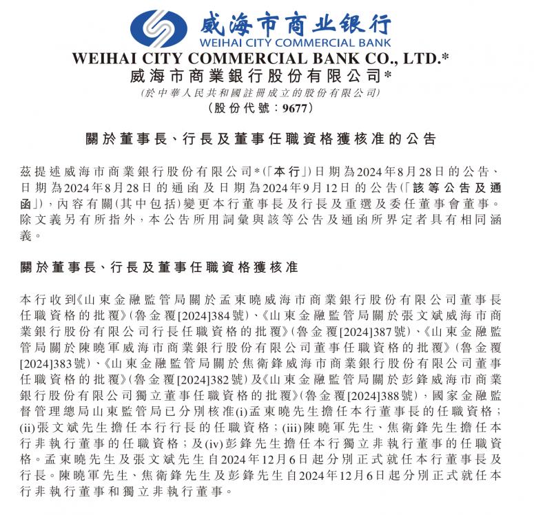 近日,威海市商业银行股份有限公司(以下简称“威海银行”)发布公告,收到山东金融监管局关于董事长、行长及其他董事的任职资格的批覆。自2024年12月6日起,孟东晓将正式担任公司董事长,张文斌担任行长。同时,陈晓军、焦卫锋将担任非执行董事,彭锋将担任独立非执行董事。