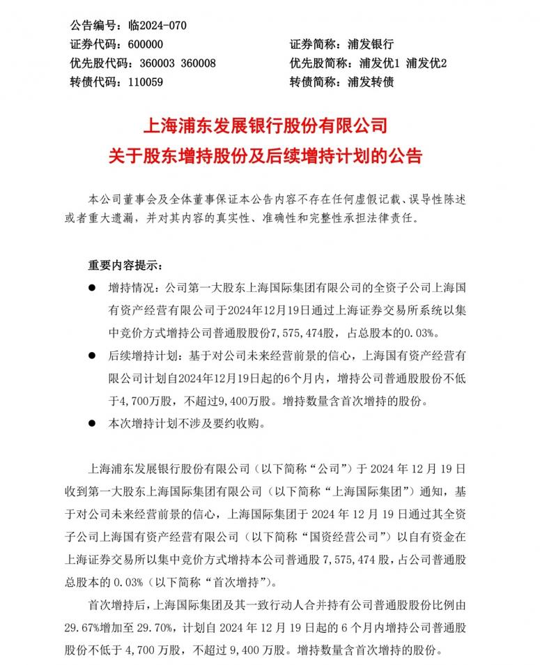 近日,浦发银行发布公告称,公司第一大股东上海国际集团有限公司(以下简称“上海国际集团”)的全资子公司上海国有资产经营有限公司(以下简称“国资经营公司”)于2024年12月19日通过上海证券交易所系统以集中竞价方式增持公司普通股股份7,575,474股,占总股本的0.03%。此外,国资经营公司计划自2024年12月19日起的6个月内,增持公司普通股股份不低于4,700万股,不超过9,400万股,增持数量含首次增持的股份。