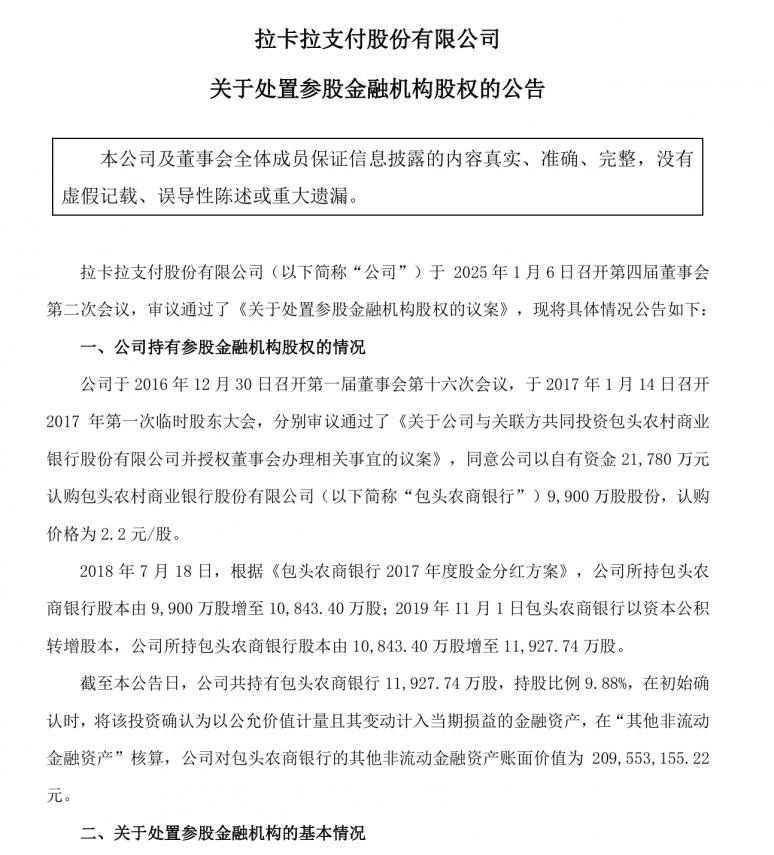 1月6日,拉卡拉支付股份有限公司(以下简称“拉卡拉”)发布公告称,公司审议通过了《关于处置参股金融机构股权的议案》,拟将所持包头农村商业银行股份有限公司(以下简称“包头农商银行”)1.19亿股股份(持股比例9.88%)全部以退股方式退出,在初始确认时,将该投资确认为以公允价值计量且其变动计入当期损益的金融资产,在“其他非流动金融资产”核算,公司对包头农商银行的其他非流动金融资产账面价值为 2.1亿元。