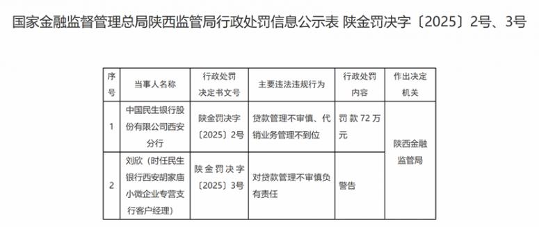 1月20日,国家金融监督管理总局陕西监管局公布的处罚信息显示,中国民生银行股份有限公司西安分行因存在贷款管理不审慎、代销业务管理不到位的问题,依据相关法律法规被处以72万元罚款。同时,时任民生银行西安胡家庙小微企业专营支行客户经理刘欣因对贷款管理不审慎负有责任,被监管部门给予警告处分。
