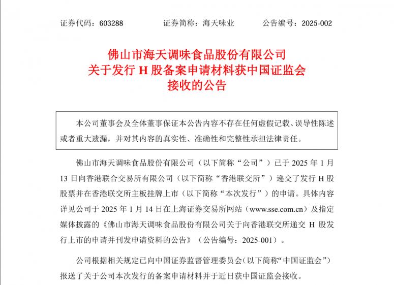 2月23日晚,海天味业发布公告,确认该公司已于2025年1月13日向香港联交所递交了发行H股股票并在香港联交所主板挂牌上市的申请。同时,根据相关规定,公司已向中国证监会报送了关于公司本次发行的备案申请材料,近日已获中国证监会接收。这是该公司第1次递表港交所,此前其已于2024年12月11日发布赴港上市公告。