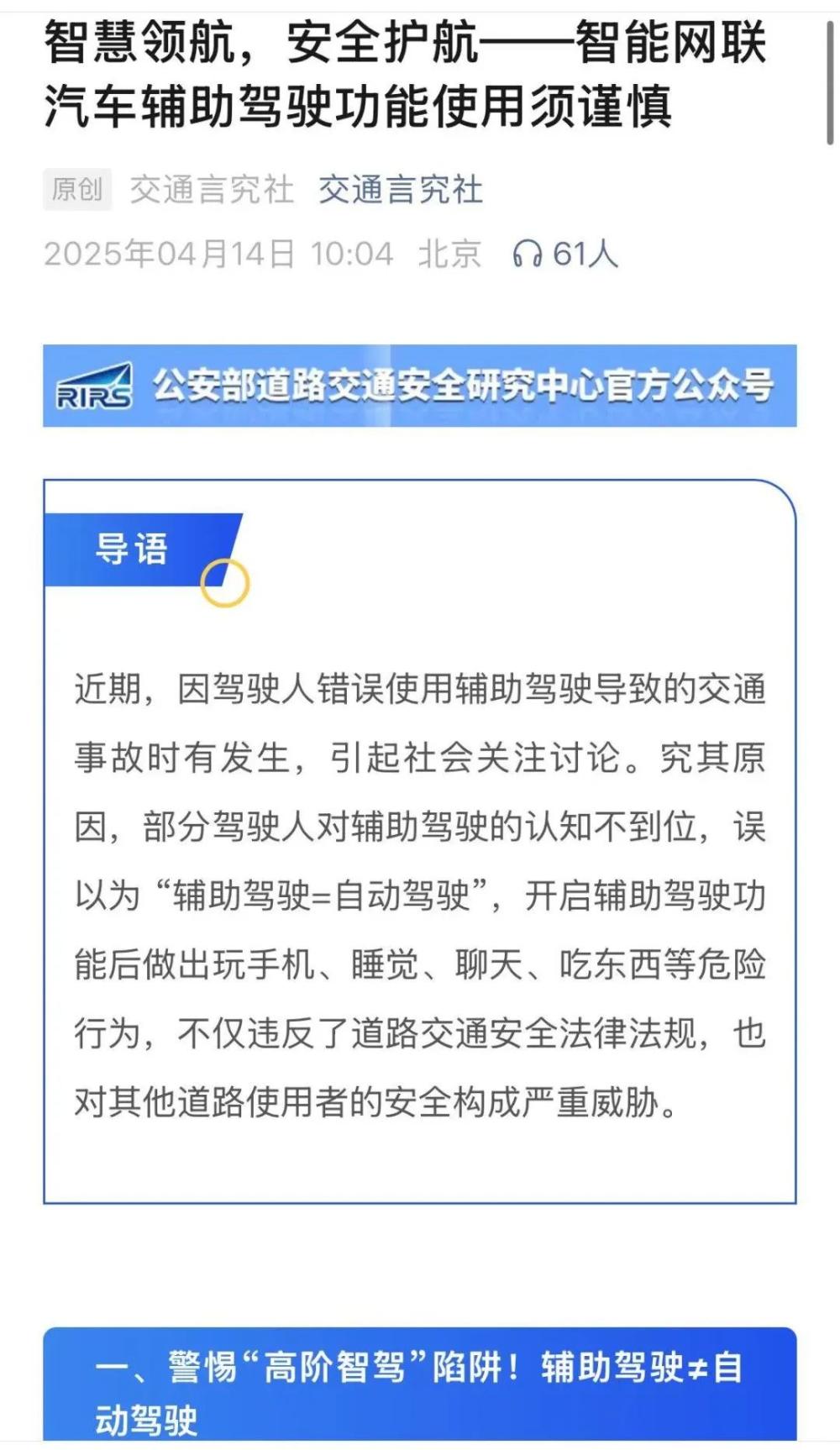 4月14日,公安部道路交通安全研究中心发文,警示消费者“警惕‘高阶智驾’陷阱!辅助驾驶≠自动驾驶”。4月16日,工信部召开智能网联汽车产品准入及软件升级管理工作推进会,明确要求车企必须清晰界定系统功能边界,杜绝夸大和虚假宣传,停止使用“自动驾驶”“智驾”等容易产生误解的表述,并严格履行用户告知义务。
