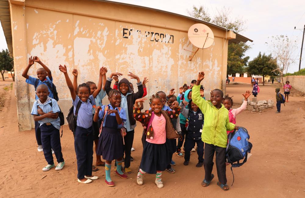 2023年7月25日,莫桑比克马普托省皮科科村学校的孩子们站在装有中国援助的卫星电视接收天线的房屋前。“万村通”项目旨在为非洲国家的1万个村庄接入卫星数字电视信号。