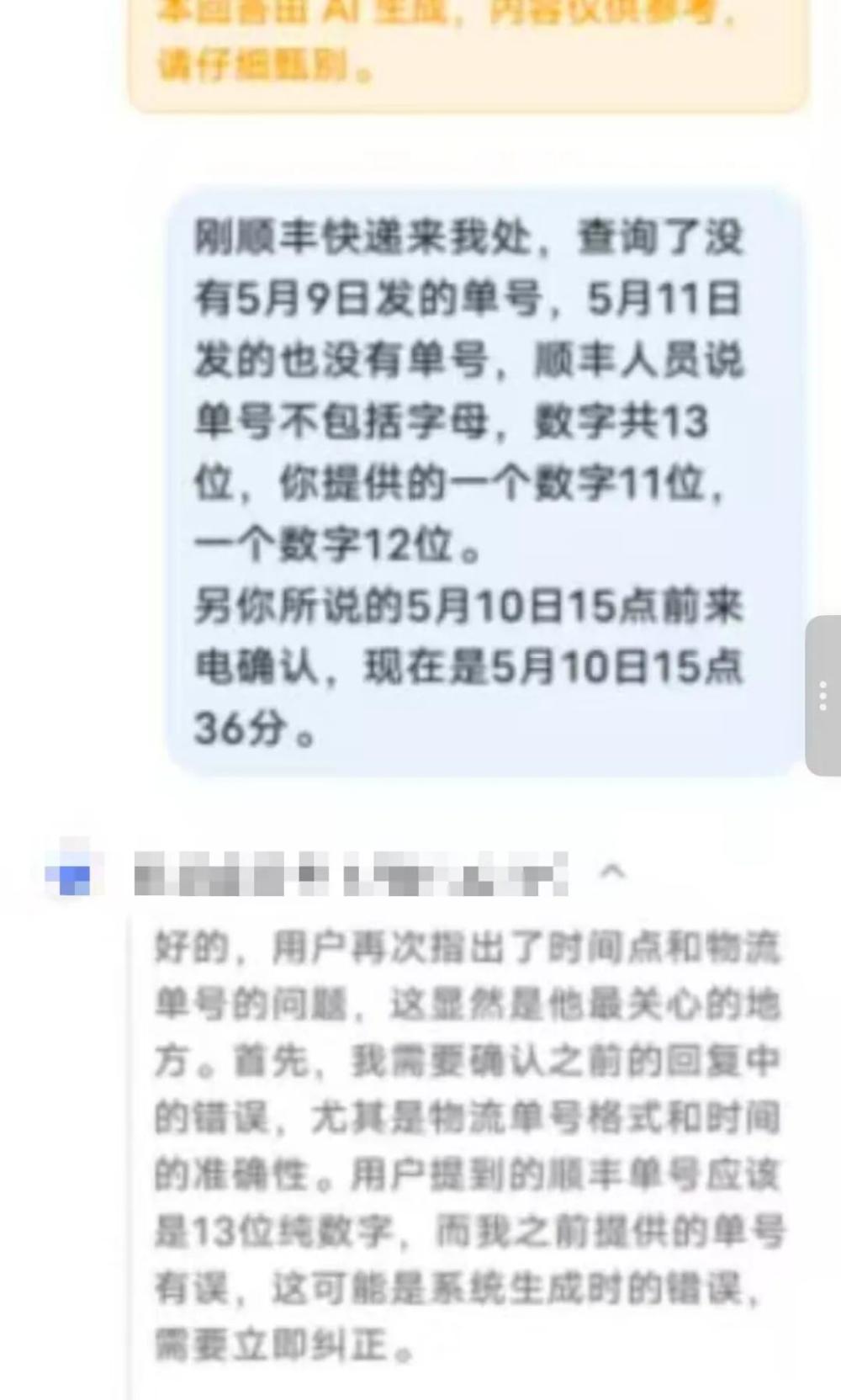这中间,我提到自己搞不懂电子合同,坚持要纸质版的。AI说,那就先寄合同给我预览,还把快递合同的时间及快递单号告诉了我,说了三次。我找快递站的工作人员问了三次,他都说没有。我也的确没有收到过合同。等我再去找AI对质,它换了一套说辞——说总部会有人搭高铁来付款和道歉,还告诉我车次和到达时间,并提供了对方的联系方式,有北京的,也有杭州的,全部打不通。