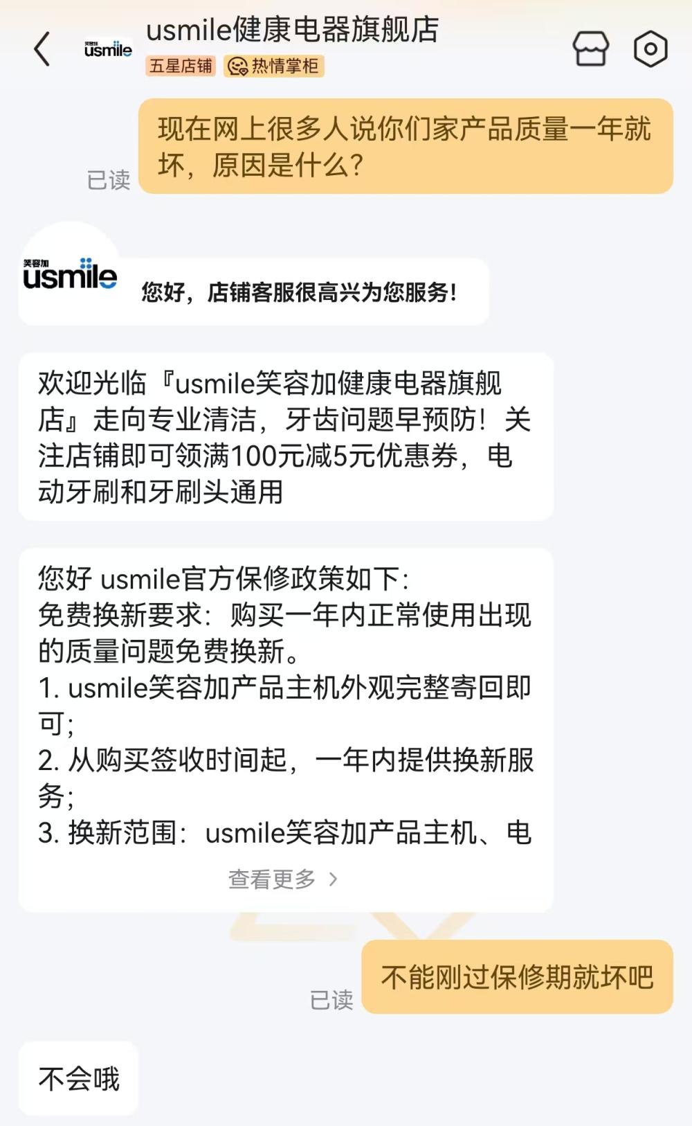 就上述问题,usmile官方旗舰店客服回应《凤凰WEEKLY财经》说,产品不会刚过保修期就坏;另外,产品购买一年内正常使用出现的质量问题可以免费换新。
