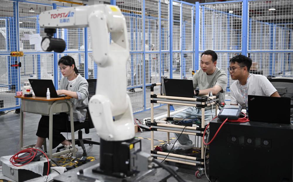 2025年3月25日,在东莞的广东拓斯达大岭山生产基地,工作人员在测试工业机器人产品。