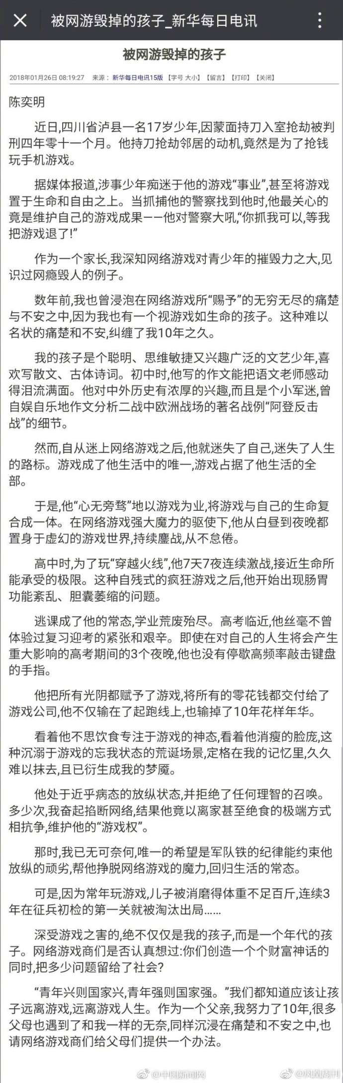 摘要:“深受游戏之害的绝不仅仅是我的孩子,而是一个年代的孩子。希望网络游戏商们有所反思!”