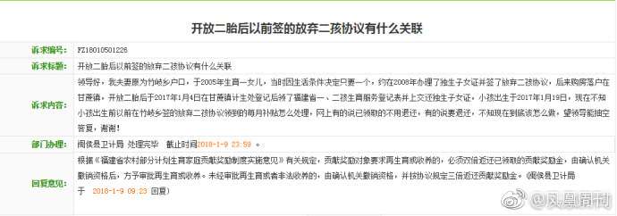 在福州市12345政府公共服务系统网站上,如今仍能看到“开放二胎后以前签的放弃二孩协议有什么关联”这则提问帖。