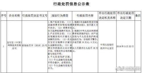 因支付宝涉及金融消费者知情权保障不充分、个人金融信息收集不符合最少必需原则、个人金融信息使用不当等7条违法行为,近日,中国人民银行杭州中心支行对支付宝开出18万元的罚单。