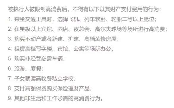 这条措施主要限制,老赖不能再乘坐飞机、火车软卧、高铁动车二等以上座位,不能买房买车,不能旅游度假,子女就读高收费私立学校等。