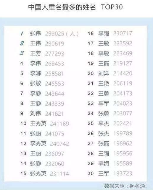重名率能与张伟一较高下的,就只有全国29万“王伟”们、27万“王芳”们、26万“李伟”们和25万“李娜”们了。